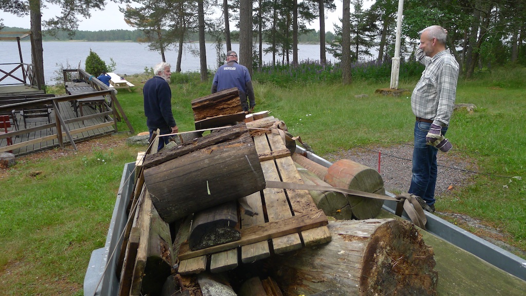 Den gamla dansbanan har varit med i över 30 år, så nu var det hög tid att fräscha upp den, eller möjligen byta ut den helt. Redan vid lördag lunch stod det klart att underredet gjort sitt. Med hjälp av lånad lastbil hämtades både regelvirke och trallvirke hem. Under söndagen blev nya bärlinor klara och ungefär en femtedel av syllarna. Under nästa arbetshelg (den är det tänkt att resten av syllarna plus själva dansgolvet ska komma på plats. Kanske ett nytt räcke också, med lite tur. Den som är hugad kan gärna snickra vidare även innan nästa arbetshelg.