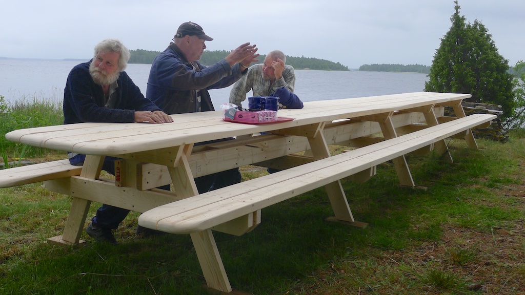 De gamla grillmöblerna vid sjön på Stenudden hade sett sina bästa år och det var hög tid för nya. Under torsdagen hämtades virket och idag kom bordet på plats. Bosse har ritat och Urban varit med och byggt, hemma hos Bosse. Det krävdes en del mankraft för att få bordet på plats – det är 7.10 långt och väger mellan 400 och 500 kg. Nu hoppas vi bara på grillväder i sommar. Välkomna!