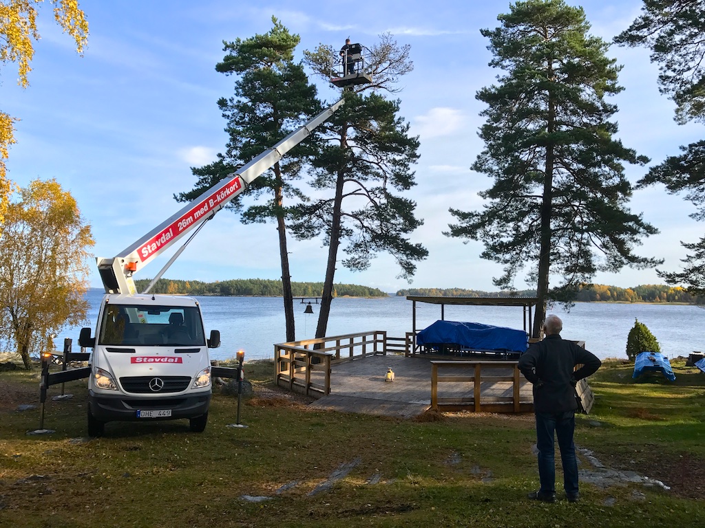 Ett par takpannor har legat på sniskan på stora huset på Stenudden och till slut blev det av att rätta till dem. Med hjälp av en stegbil och Johan Grönlund kom pannorna på plats idag. Samtidigt åkte det med en torr talltopp och någon gren också, när vi nu hade hamnat på hög nivå. En fin höstdag blev det.