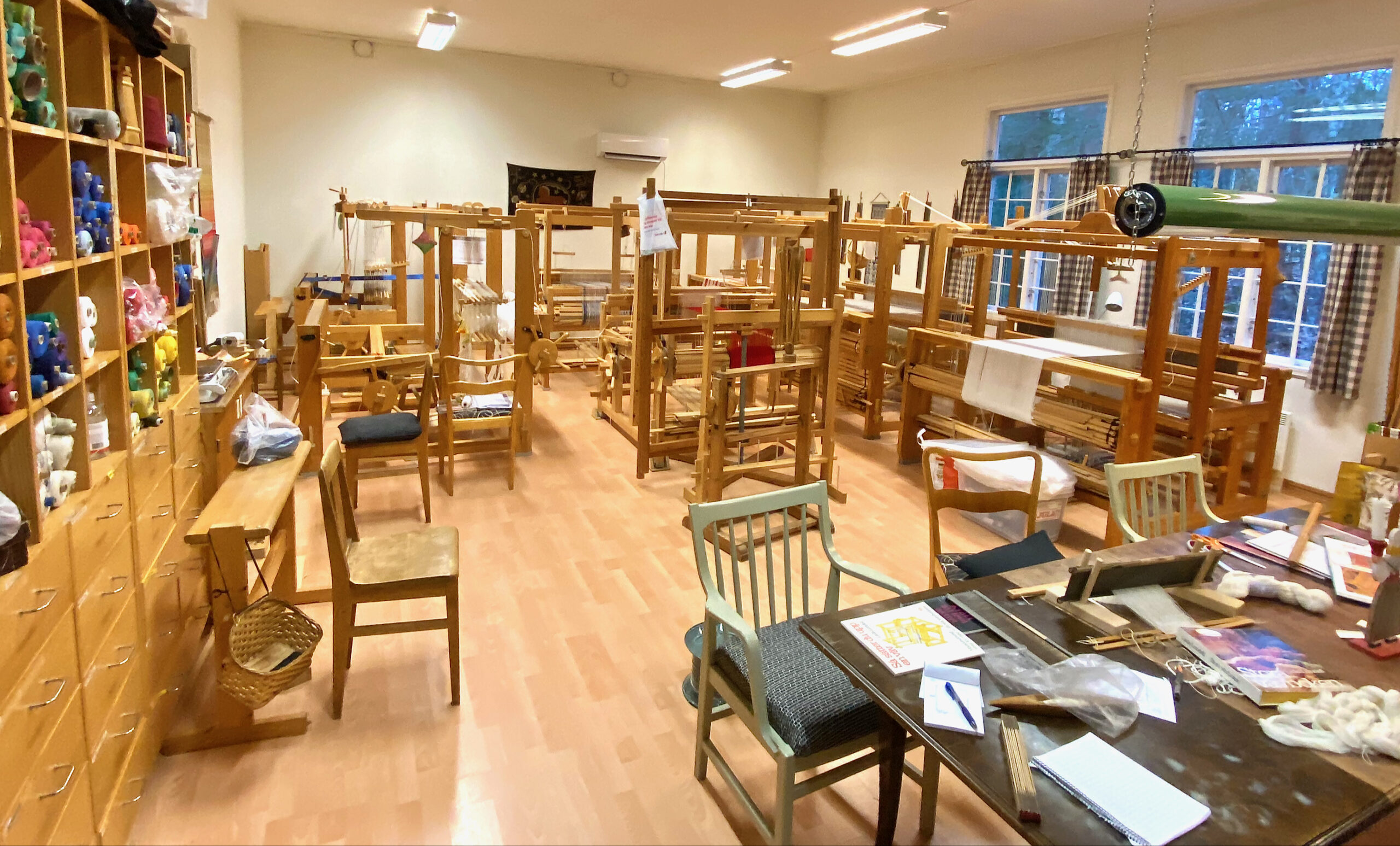 I vävsalen finns flera vävstolar i olika storlekar, med mera.